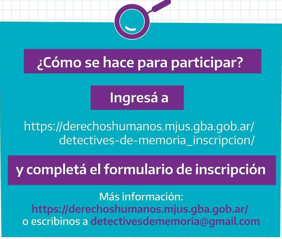 Ingresá a https://derechoshumanos.mjus.gba.gob.ar/detectives-de-memoria/ y completá el formulario de inscripción.