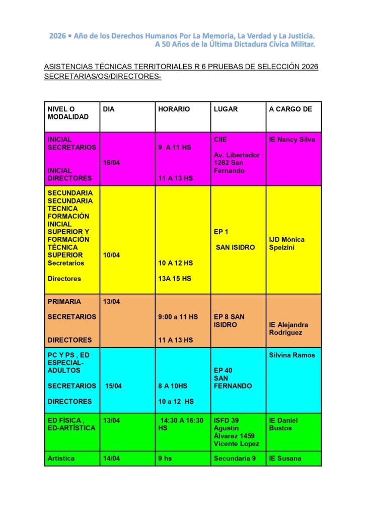 SAD remite cronograma de asistencias tecnicas territoriales para prebas de selección. Se solicita difundir y notificar bajo acta a los docentes.